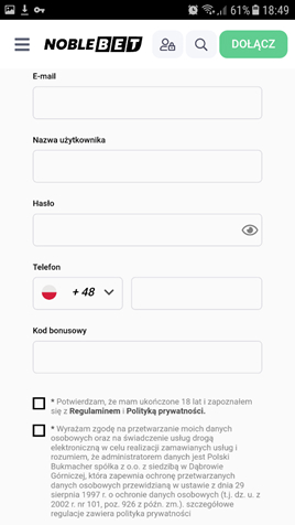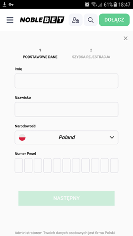 Proces rejestracji online u buków zazwyczaj składa się z dwóch etapów. Noblebet nie jest oczywiście wyjątkiem. Po pierwsze, gracze muszą założyć konto tymczasowe z kodem promocyjnym, które jest szybkie i kwalifikuje się do bonusu powitalnego, który umożliwia graczom dokonywanie wpłat. Przy tym konta tymczasowe mają pewne ograniczenia i zalecamy jak najszybszą weryfikację.