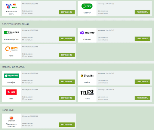 Выберите удобный способ пополнения. Можно внести депозит как онлайн, так и наличными через терминал «Элекснет». Минимальная сумма ввода средств – 100 р. для всех методов.