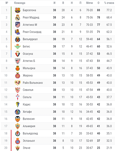 В этом сезоне Испанской Ла Лиги традиционно принимают участие 20 команд. На смену вылетевшим в Сегунду Эльчу, Эспаньолу и Вальядолиде в чемпионат пришли Гранада, Лас-Пальмас и Алавес. На новогодние каникулы команды ушли, проведя 18 полноценных туров. За это время мы увидели немало сенсаций, а в турнирной таблице сформировались фавориты и аутсайдеры чемпионата. В данный момент турнирная таблица Ла Лиги выглядит следующим образом: